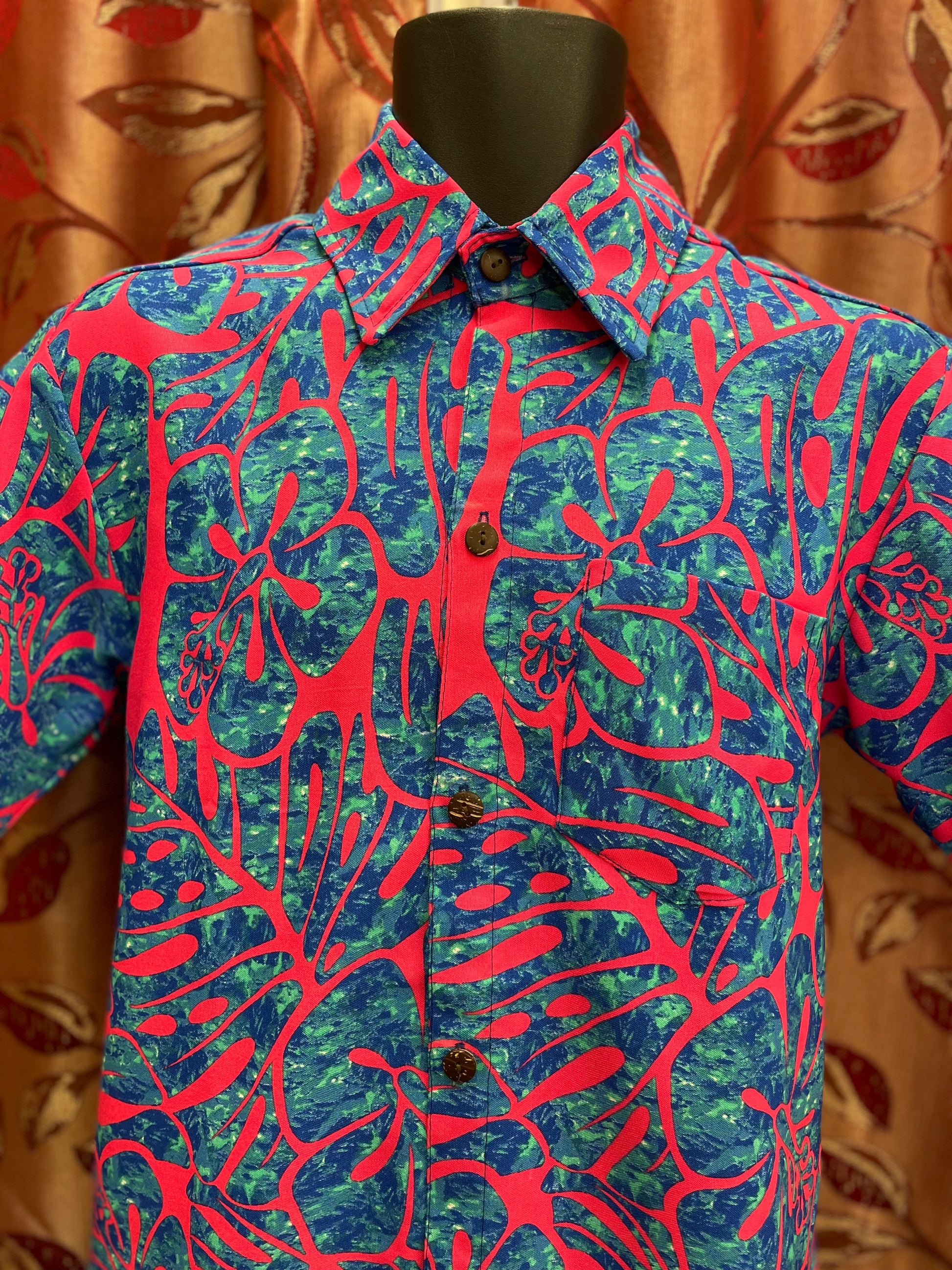 Bright and bold, this short sleeve island shirt is designed for comfort, tradition, and style. It features a vibrant blue and pink floral-inspired island print, perfect for cultural events, family occasions, or casual wear. The button-up front and classic collar bring a smart yet relaxed look, while the lightweight fabric makes it ideal for all-day wear. Pair it with the matching women’s dress for a coordinated island outfit.