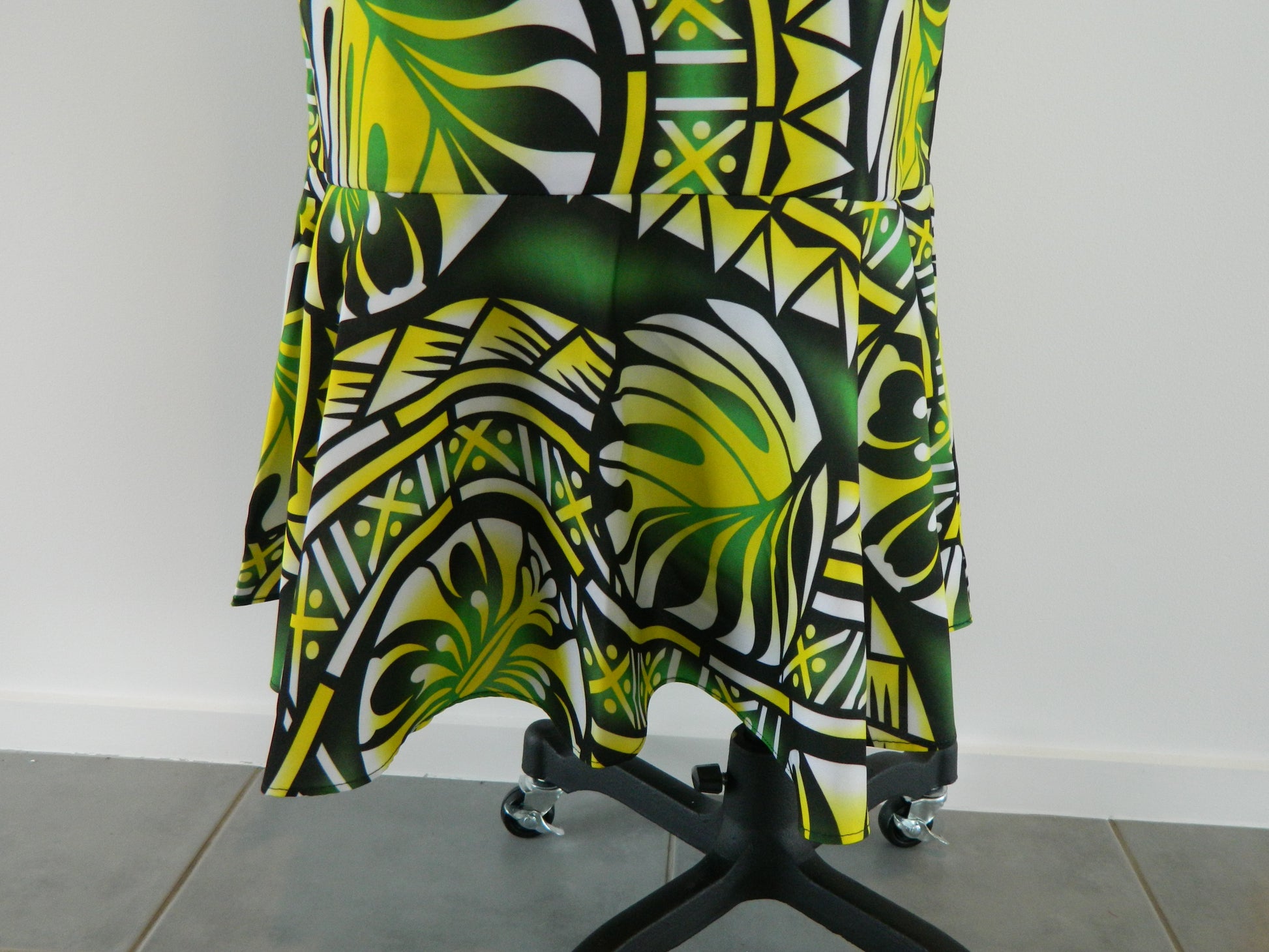 - Print: Bold Pacific-inspired pattern in green, yellow, black, and white
