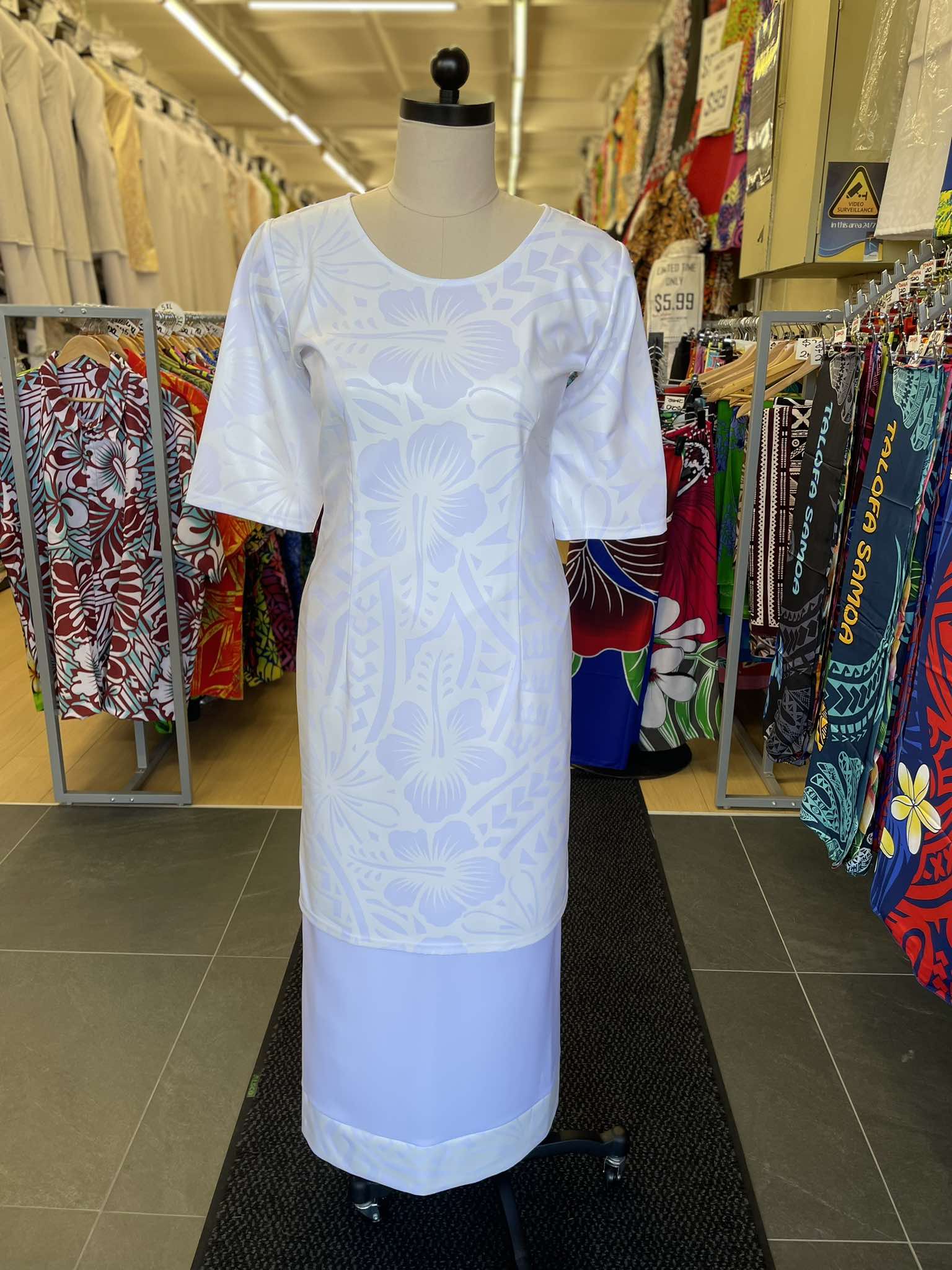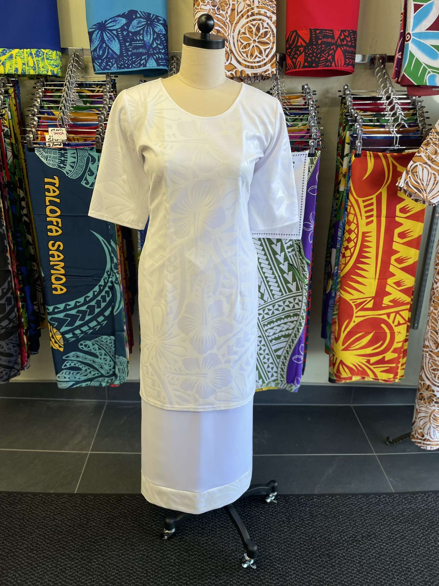 This elegant White Puletasi is designed with comfort and cultural style in mind. Made from soft, stretchy fabric with subtle woven floral island motifs, it pairs a lavalava with matching border. for a polished, traditional look. The 3/4 sleeves and rounded neckline add modesty and elegance, while the plain white hemline panel provides a refined finishing touch. A versatile outfit ideal for both cultural pride and formal elegance.